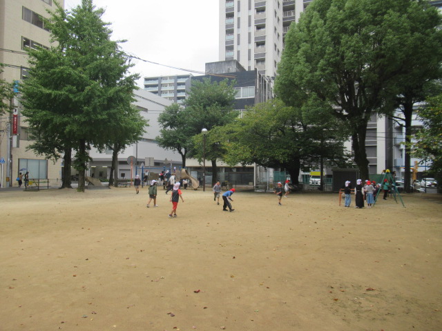 次は、楽しみにしていたお弁当です。近くの公園で・・・と考えていたのですが雨が降ってきました。天気予報を見ながら、何とか大丈夫だろうということで五島町公園で食事をとることにしました。友達と一緒に美味しいお弁当を食べ、少し体を動かし、次なる目的地の消防署見学へと向かいました。