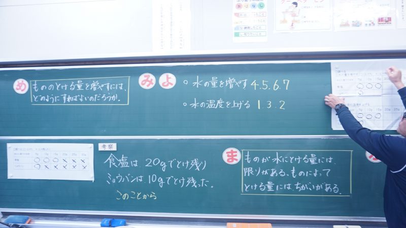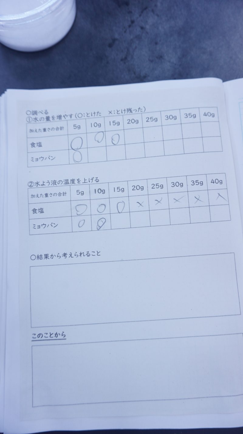 5年生【学校生活】 (5年生)理科「もののとけ方」学習中 【更新日】2025年11月14日 11月14日(金) 理科では、「もののとけ方」という単元を学習しています。 今回は、「もののとける量を増やすには、どのようにすればよいのだろうか?」という問題を実験によって明らかにしました。 実験の前に、「水の量を増やす」「水の温度を上げる」という予想を立てました。 水に溶かすのは、食塩とミョウバンです。 それぞれ、班に分かれて安全に気を付け、協力しながら実験を進めました。 次の時間は、実験結果から考えられることをまとめます。 自然の事物や現象について、理科の見方・考え方を働かせて問題を追究している5年生です(^^)/