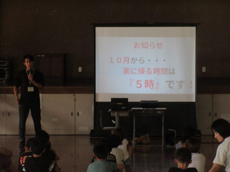 学校風景【学校生活】 全校集会 【更新日】2025年09月30日 全校集会では、校長先生から校長室前に掲示している3つの思いについて、教頭先生からはものを大切にする心について、担当の先生からは9月と10月の生活目標について、10月から帰る時刻が6時から5時に変わることなどの話がありました。 子どもたちの聞く姿勢がよくなっていて成長を感じました。