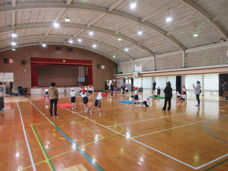 2年生はマット運動でした。前転や後転など保護者の方もサポートしてもらいながらがんばっていました。