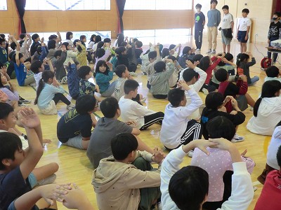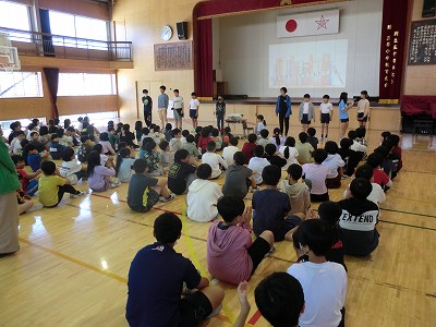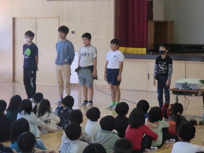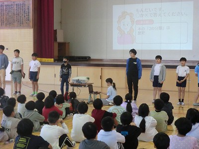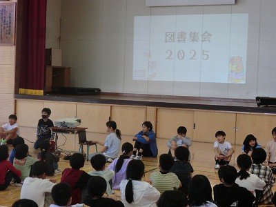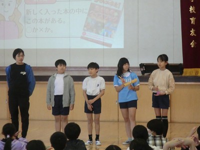 R7 2学期【学校生活】 10/28(火)図書集会 【更新日】2025年10月30日 11月4日から11月14日は、読書週間です。図書委員会が中心となって図書集会を開きました。内容は図書に関するクイズと読書週間での取組についてです。みんなが本を読みたくなる楽しい企画を考えてくれました。