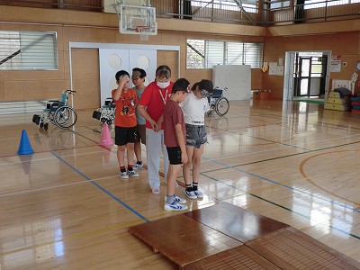 R7 2学期【学校生活】 10/6(月)福祉体験学習(4年生) 【更新日】2025年10月28日 福祉について学んでいる4年生が、高齢者疑似体験や車椅子体験、アイマスク体験を行いました。高齢者や障害のある人がちょっとした行動に不便さを感じている状況や自分たちはどのようなサポートができるのかを学びました。