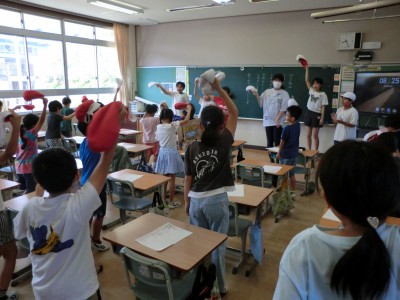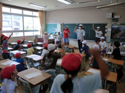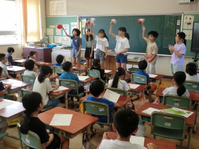 R7 2学期【学校生活】 9/24(水)励ます会朝練習 【更新日】2025年10月28日 小体会出場選手を励ます会が行われます。その中で1年生から5年生までが6年生へ応援を行います。その練習のために5年生が中心となって応援を考えてくれました。朝の時間をつかって1年生から4年生までに教えてくれています。毎朝、元気のいい声が校舎に響いています。