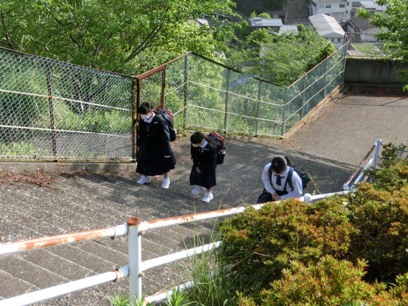 また、本校は草や木に囲まれた素晴らしい環境にありますが、生徒は朝から長く、苦しい階段を上って登校します。私も徒歩通勤でその苦しさを実感していますが、「ピンチはチャンス」本校の生徒は、3年間の登下校で「心と体」が鍛えられることを期待します。ちなみに今年度は徒歩通勤の先生方が5名に増えました。