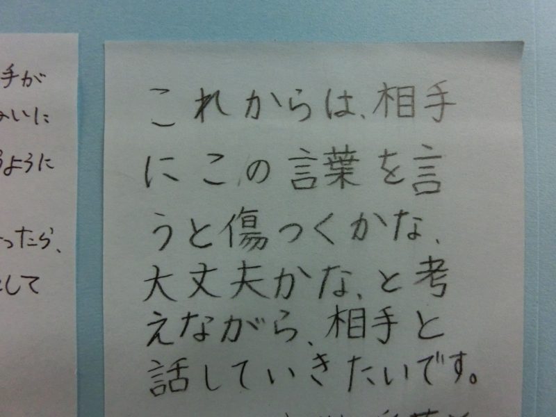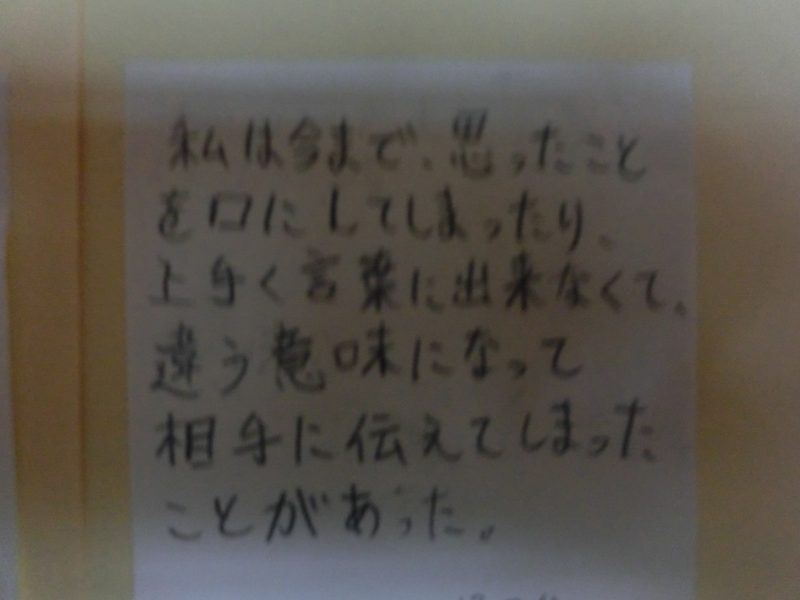 一年生の様子 【更新日】2022年12月14日 県内の中学校でのいじめ事案が問題になっていますが、本校では人権集会の取組を通して、おもいやりややっていいこと悪いことの判断のできる生徒を目指す取り組みを行っています。1年生の廊下には現在の自分と未来の自分の姿を書いたカードが掲示していました。すべてのカードを読ませてもらいましたが、1年生の成長を感じました。保護者のみなさま16日(金)のPTAの時御覧ください。