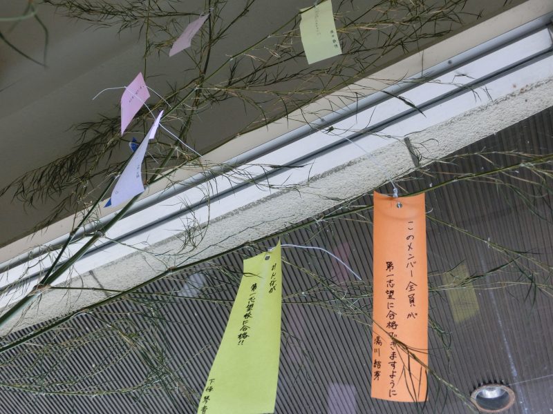 七夕伝説(失敗・許す・学ぶ)・七夕飾り・七夕メニュー 【更新日】2022年07月07日 (七夕伝説の紹介)彦星は、とても立派な若者。織姫も、美しい娘です。二人は結婚して、楽しい生活を送るようになりました。でも、仲が良過ぎて仕事を忘れて、遊んでばかりいました。すると、天の神様のもとへ、皆が文句を言いに来るようになりました。「織姫が機織りをしないので、皆の着物が古くてボロボロです。早く新しい着物を作って下さい」「彦星が世話をしないので、牛たちが病気になってしまいます」神様は、すっかり怒ってしまい「二人は天の川の、東と西に別れて暮らすがよい」と、言って、織姫と彦星を、別れ別れにしたのです。でも天の神様は、織姫があまりにも悲しそうにしているのを見て「一年に一度だけ、七月七日の夜だけ、彦星と会ってもよろしい」とお許しを出しました。 それから、一年に一度会える日だけを楽しみに、織姫は毎日、一生懸命に機を織りました。彦星も、天の牛を飼う仕事に精を出しました。そして、待ちに待った七月七日の夜、織姫は天の川を渡って、彦星の所へ会いに行きます。失敗から学ぶ経験の大切さが込められたお話ですね。今日の給食(七夕メニュー)を紹介します。 生徒用玄関には七夕飾りが準備され、生徒がそれぞれの願い事を書いていました。