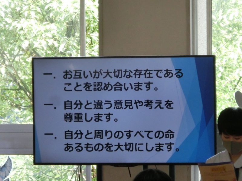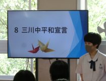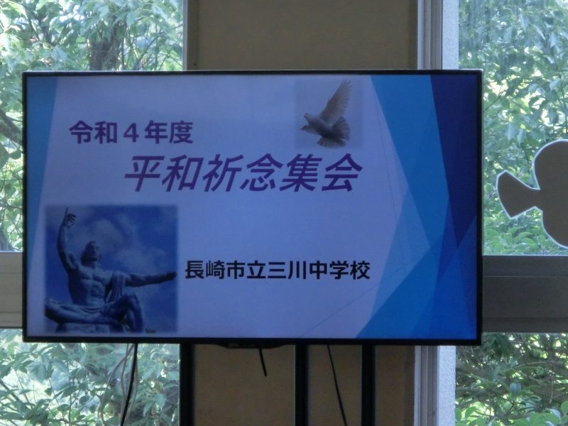 平和集会 【更新日】2022年08月17日 8月9日(火)77回目の原爆の日を迎えました。本校でも平和集会が開催され、①長崎市民として、原爆の悲惨さを知り、そのことを世界に発信できる人になること。②戦争の非人間性と残虐性を知り、戦争や差別をしない。許さない人になること。③三川中の平和を築こうという意識を持つこと。の3つを目的に実行委員を中心に実施しました。