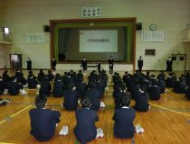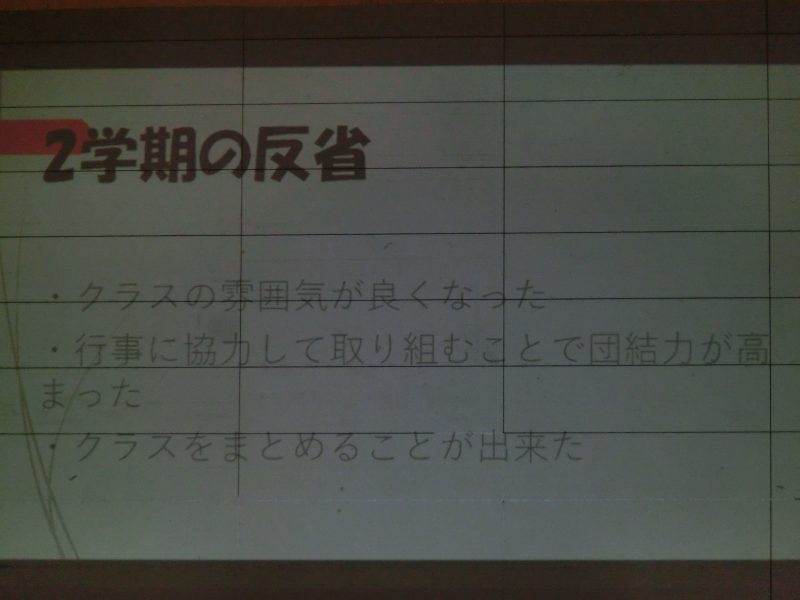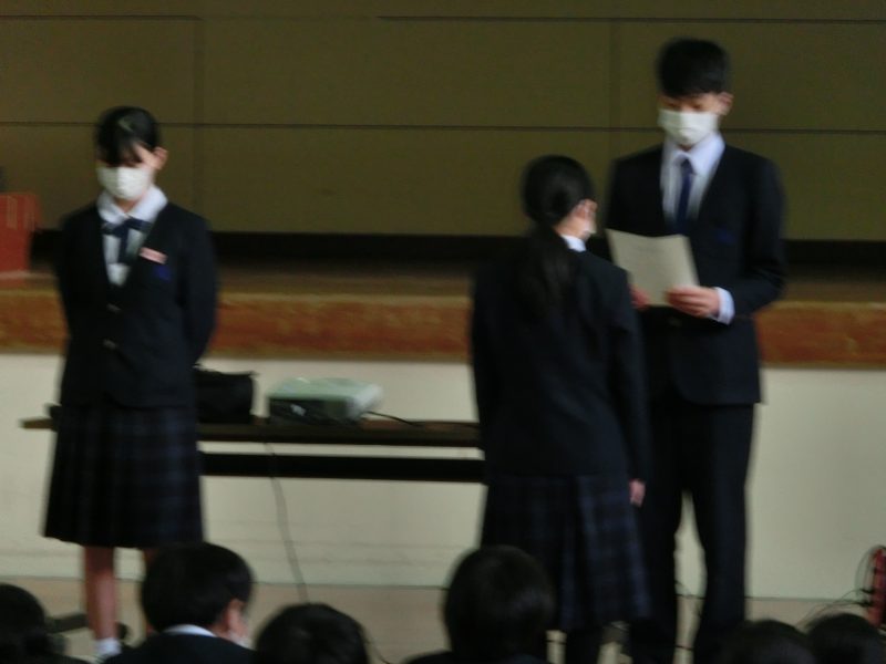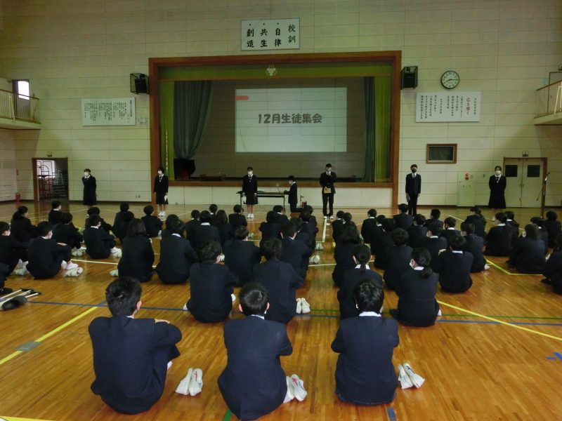 生徒集会 【更新日】2021年12月22日 今学期最後の生徒集会が行われました。生徒会は3学期から新生徒会役員でスタートするため1年間のお礼を述べる専門委員長もいました。生徒会役員のみなさん1年間お疲れ様でした。