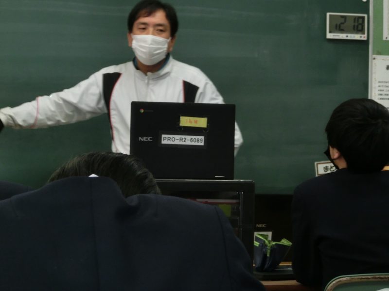 研究授業 社会科 3-2 【更新日】2023年01月12日 本日、3年2組で社会科の研究授業が行われました。3学期の目標である発表する生徒が多く、みんなしっかり考えていました。クロームブックや電子黒板を活用した授業でした。欠席者のためにオンライン授業も行われました。授業の様子を紹介します。
