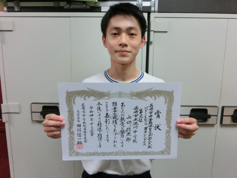 長崎市バドミントン新人大会 【更新日】2022年10月25日 週末開催された長崎市新人大会バドミントン競技の様子をお伝えします。生徒たちは緊張した表情でがんばっていました。 女子はベスト8、男子シングルスに出場した山口君が3位に入賞し、県大会への出場権を獲得しました。県大会での活躍を期待します。