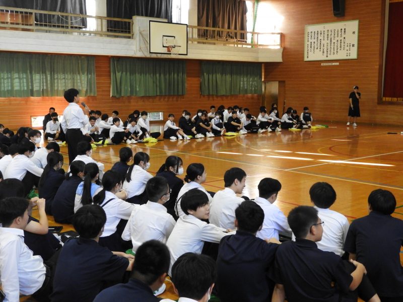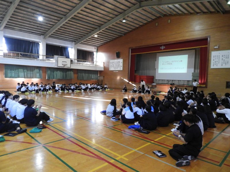 長崎中・桜馬場中・片淵中の統合後の学校名について、長崎中としての案をどうするか、生徒全員が集まって討議しました。今後、長崎中、桜馬場中、片淵中、地域の方々からの案が出そろったところで住民の方々の投票で新校名が決定します。