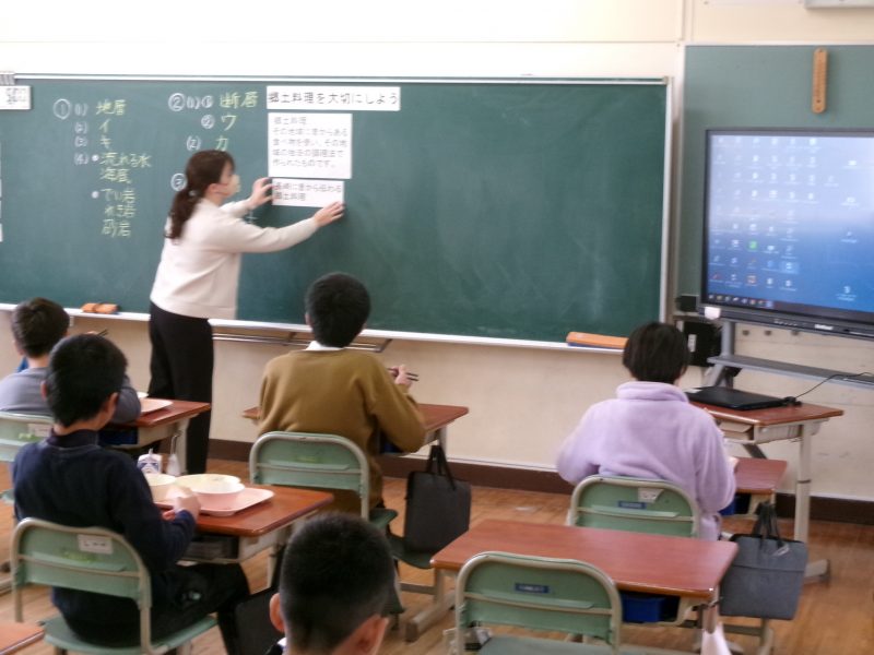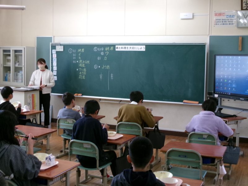 今日の様子【学校生活】 食育指導(11/19) 【更新日】2025年11月20日 この日の給食時間に村松小学校から学校栄養職員の方に来ていただき、5年生・6年生に向けて食育指導が行われました。 「郷土料理」について説明をしていただきました。「私たちの郷土料理は何?」と聞かれて、子どもたちは何を答えるでしょうね。是非、ご家庭でも話題にされてみてください。
