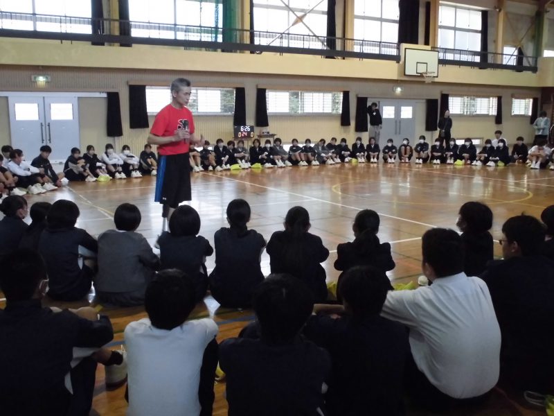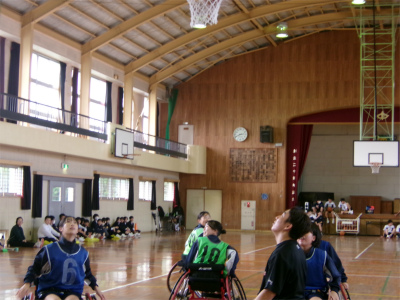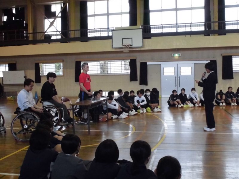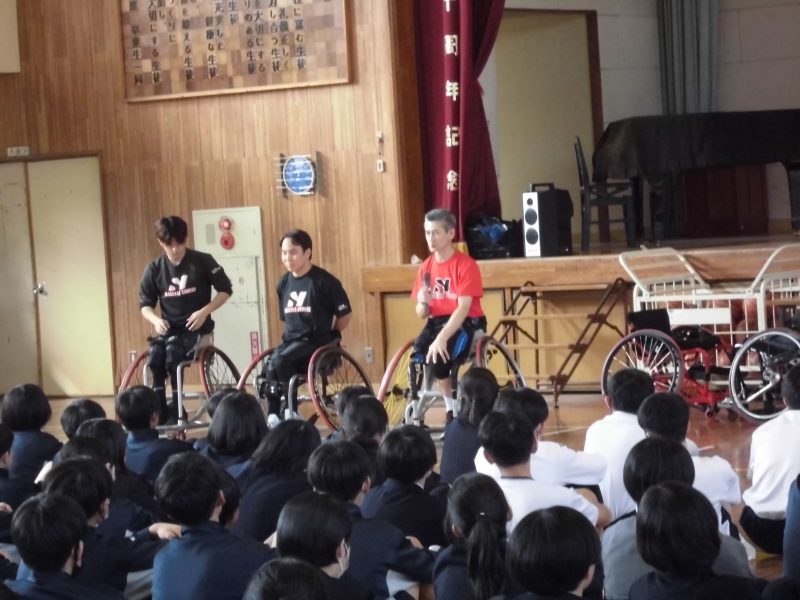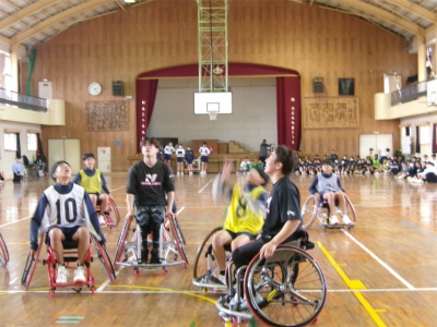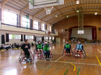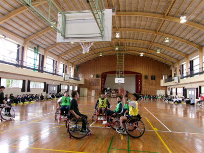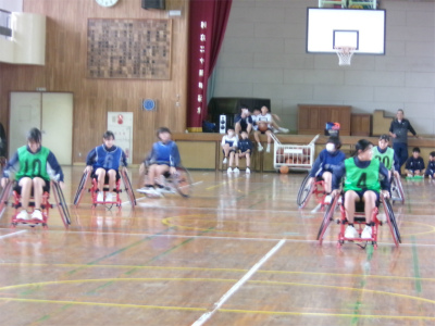 学校生活【学校生活】 10月31日 2年車椅子バスケット体験 【更新日】2025年10月31日 2年生が車椅子バスケットに挑戦をしました。 車椅子は、運動用で軽量、小回りが利く、安全ベルトがある、補助の車輪がついている等の安全性の工夫がたくさんありました。 長崎サンライズから3名の講師の方をお招きし、体験学習並びに講話と行いました。
