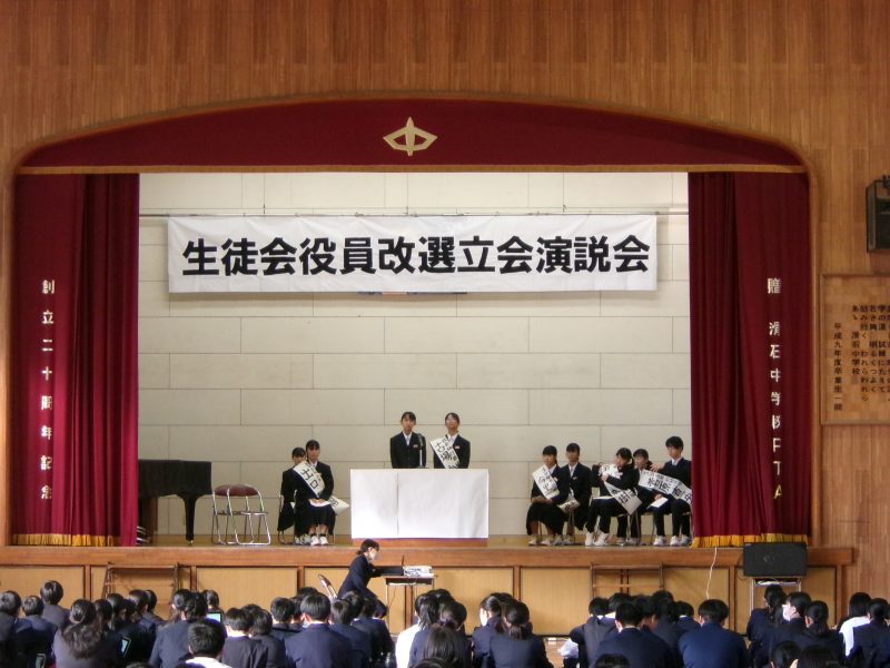 学校生活【学校生活】 11月26日(水)生徒会役員選挙 【更新日】2025年11月26日 11月26日(水)生徒会役員選挙の立会演説会及び投票が行われました。 1年執行部、2年執行部、副会長、会長の順に演説が行われました。 立候補者、応援演説者ともに堂々と思いを述べ、生徒たちも熱心に聞いていました。 このあと投票が行われました。結果は明日の給食の時間に発表されます。