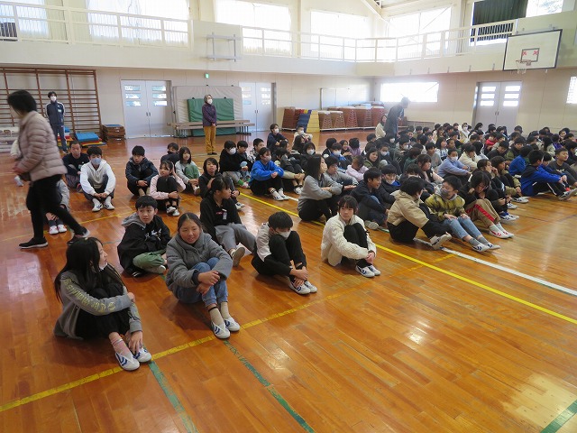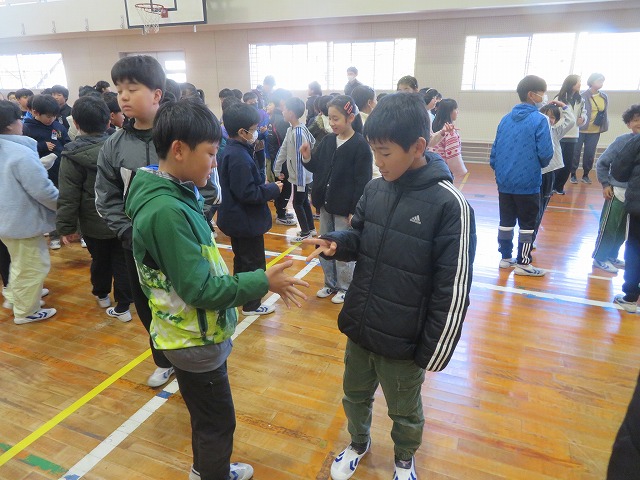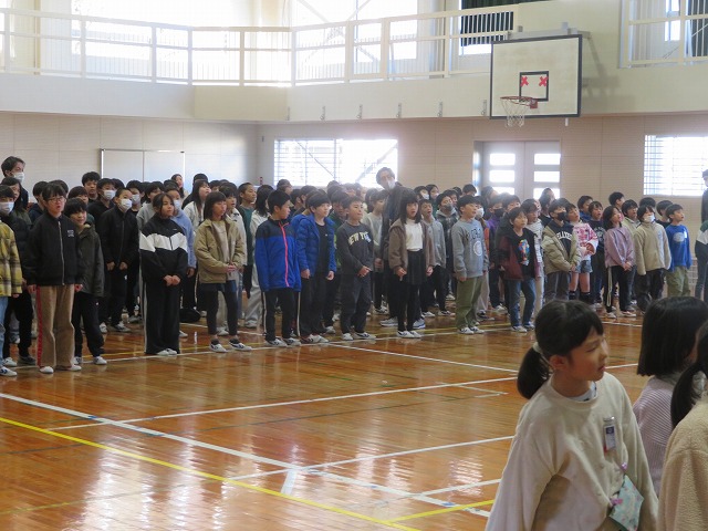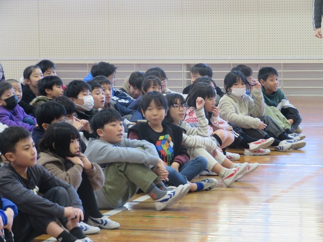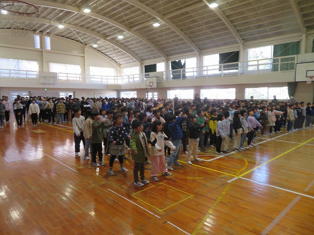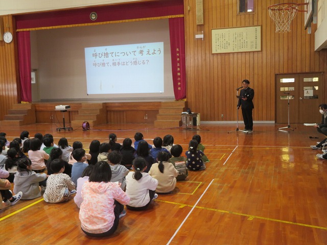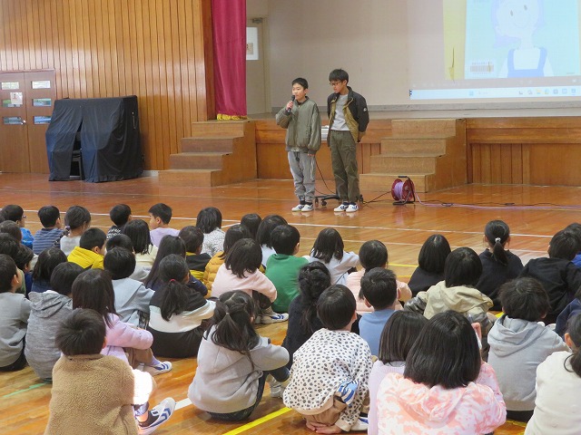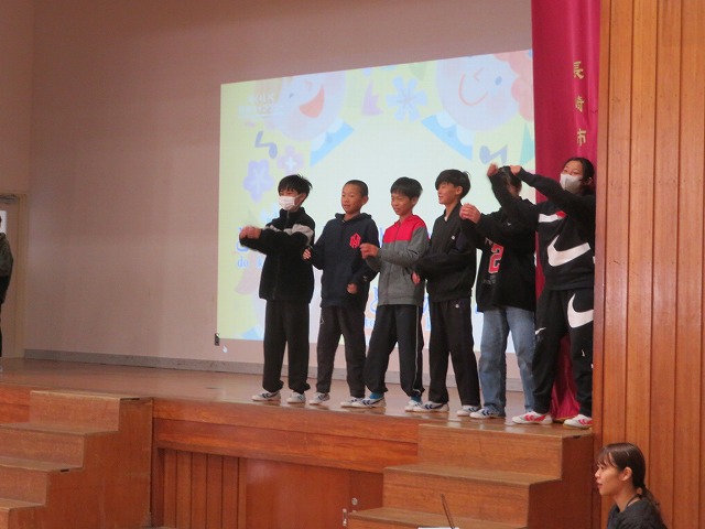 この集会では、5年生代表2名が始めの言葉を述べました。集会委員会が中心になりアイスブレーキング「しあわせジャンケン」をしたり、「友達になるために」の歌を手話付きで歌ったりしました。そして、教頭先生から「心は言葉で動く(言葉は見えないけど心に届く)」話を聞きました。次に、平尾先生から「だいじ だいじ どこだ?」「みんな笑顔になれますように」など4冊の本の紹介と読み語りがあり、6年生2名が終わりの言葉を述べました。