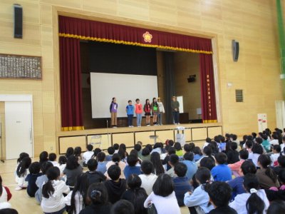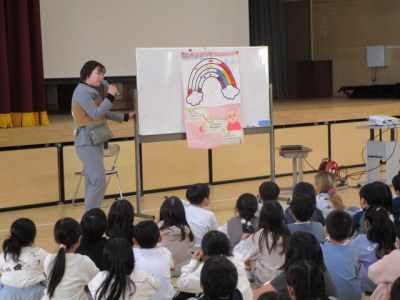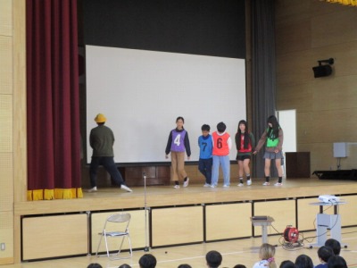 学校の様子【学校生活】 全校集会(12/2) 【更新日】2025年12月11日 全校集会で校長講話の後に生活指導についての話があります。今日は、2学期に重点的に取り組んでいる挨拶についての話でした。生活指導担当教師のクラスの有志の子どもたちが寸劇をすることで、皆に分かりやすい話になりました。こういう場面でも物おじせずに、堂々と台詞を言ったり、ユーモアを交えたりできる6年生は、やっぱり素敵ですね。 今月の生活目標は、「あいさつ名人になろう」で、挨拶への取組の総仕上げです。ご家庭でも子どもたちに意識させていただくとありがたいです。