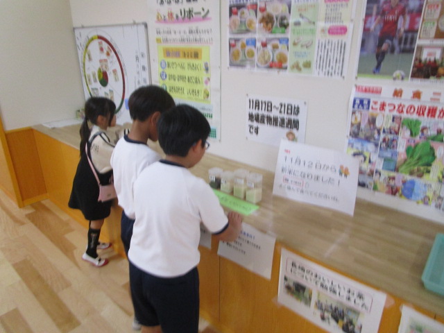 学校の様子【学校生活】 地場産物推進週間(11/17~21) 【更新日】2025年11月21日 今週は「地場産物推進週間」でした。給食では、長崎県産の肉や魚、野菜や果物が毎日提供されました。また、11月12日(水)からは、新米が提供されています。 このように工夫された給食や食育を行っていても、大規模校では給食の残量が多い傾向にあります。実は、本校も給食残量が近隣の小学校よりも多い小学校です。 そんな中、給食委員会児童が「もぐもぐ大作戦」なる活動を現在行っています。自校の課題を自分たちでみつけ、それを解決するために行動することができる本校の子どもたちは本当に素敵です。