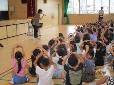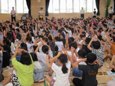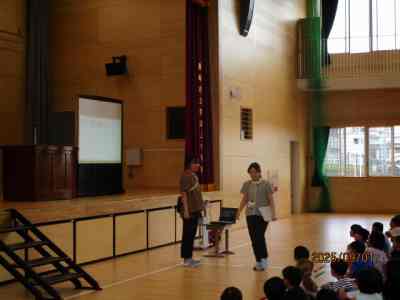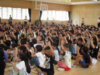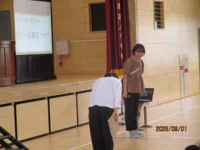 2学期の生活の重点目標は「挨拶と返事です」 との説明があり、数名の教師が寸劇を行い、良い挨拶について子どもたちに問いかけました。