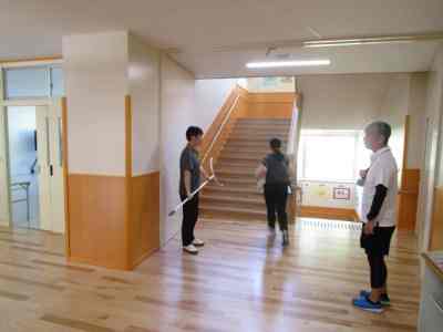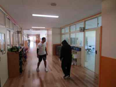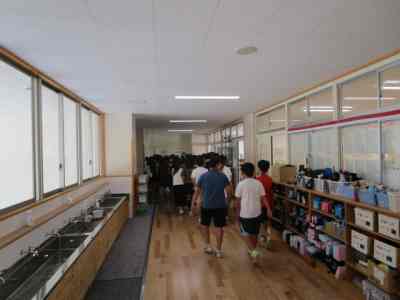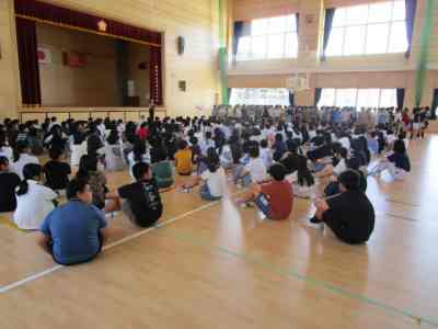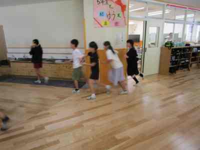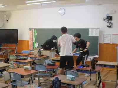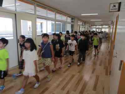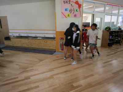 本日は、不審者対応の避難訓練を行いました。3階の5年生教室に不審者がやってくるという想定で行いました。5年担任は、廊下にいる不審者に声をかけ、子どもたちを不審者から遠ざけ、避難させます。3階の4・5・6年生は、不審者から遠ざかるように動き、体育館に避難し施錠します。2階の廊下や階段では、さすまたを持った職員が不審者を見張ります。今回は、不審者から離れている1・2・3年生は、教室の出入り口に机やいすでバリケードを作り、施錠して窓側に避難しました。施錠がしっかりとできる新校舎ならではの避難方法を考え実践しました。