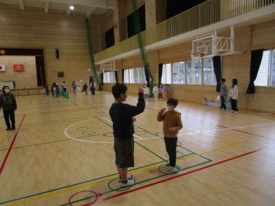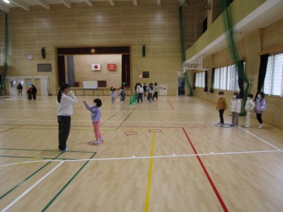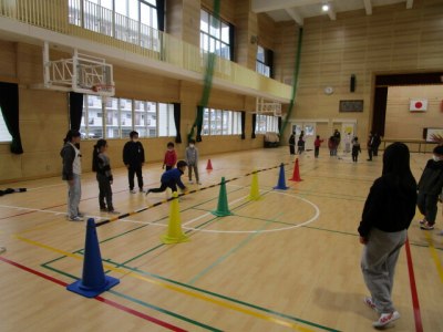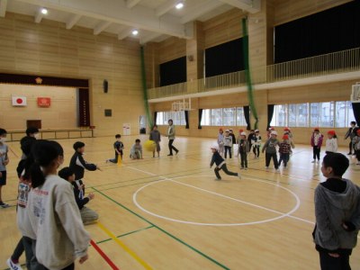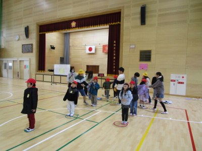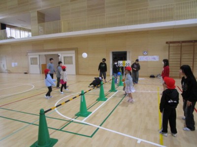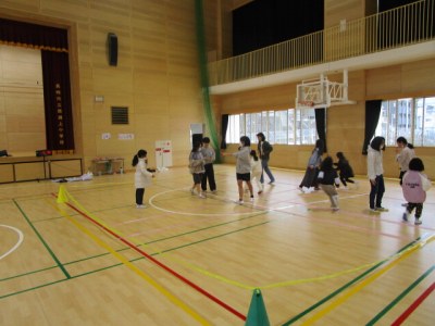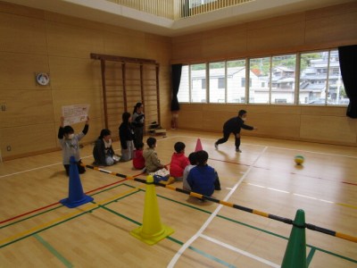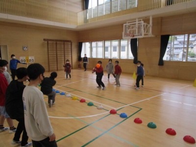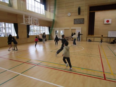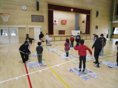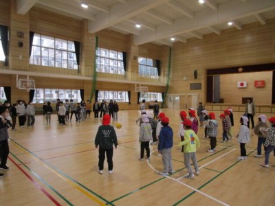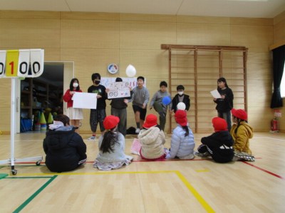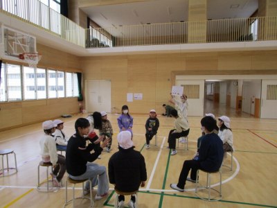 体育館に1年生の1クラスと6年生の1クラスが一緒に入っていきます。総合的な学習や生活科の学習かな?と思っていたら、6年生の国語科の学習だそうです。
