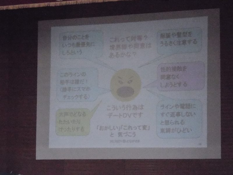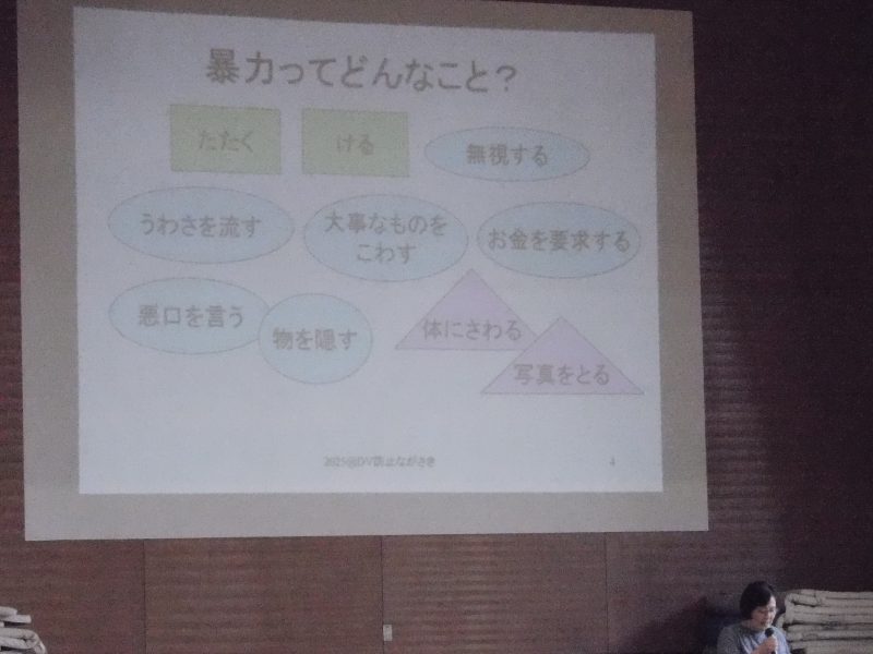 学校行事【学校生活】 デートDV防止教室 【更新日】2025年10月07日 本日は、3年生を対象にして「デートDV防止教室」を行いました。 デートDVとは、交際関係にある者同士の間で起きる暴力のことで、中高生や大学生といった若い世代の交際関係でも多く発生しており、身近な社会問題でもあります。 NPO法人 DV防止ながさきのK先生より、デートDVが起こる背景や良好で対等な人間関係の築き方、命や性の大切さについて講義していただきました。 本日の学習を通して、デートDVの加害者にも被害者にもならないための意識を持ってほしいと考えます。
