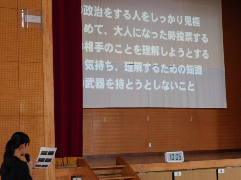 本日は、朗読「ヒロシマ 消えた家族」、平和アンケートの報告と考察、各学年による発表を行い、11:02に全校生徒による黙祷を行いました。