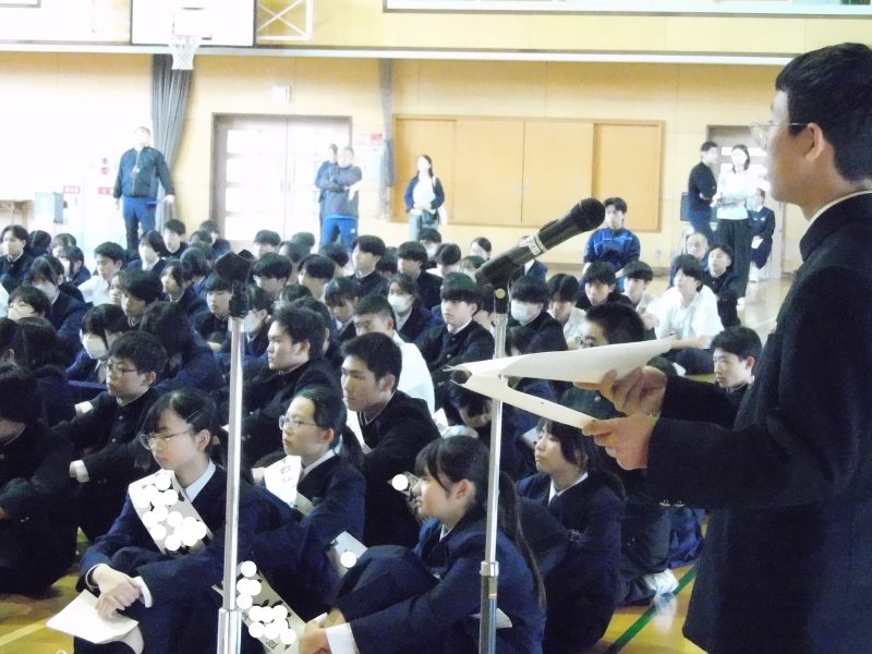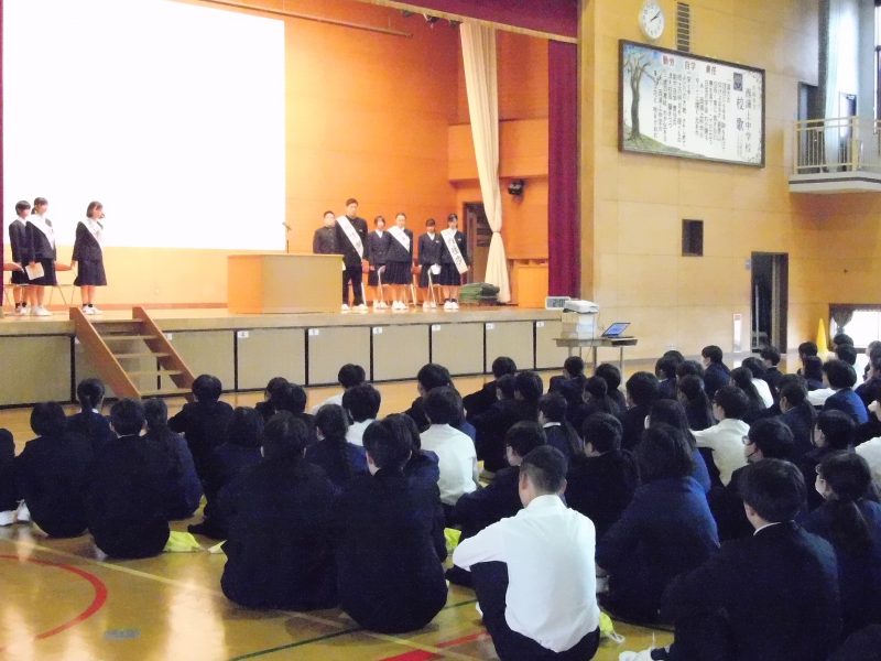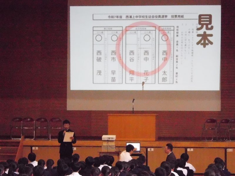学校行事【学校生活】 役員改選 立会演説会 【更新日】2025年12月02日 本日、来年の生徒会役員改選に向けた立会演説会を行いました。 5名の立候補者と応援演説者は、それぞれに西浦上中学校のこれまでの伝統を引き継ぎ、新しい歴史を創りたいと熱く呼びかけました。 新しい生徒会役員によって、さらに活気のある学校になることを期待しています!