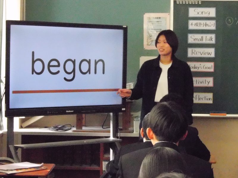 楽しい雰囲気の中で、「受け身」の表現を繰り返し練習しました。また、電子黒板を用いた説明については、生徒がしっかりと顔を上げて、よく聞いていました。