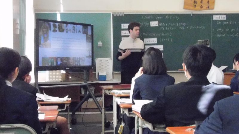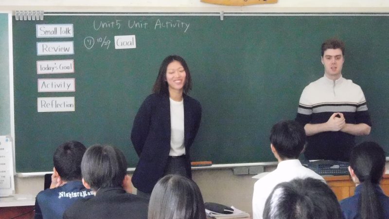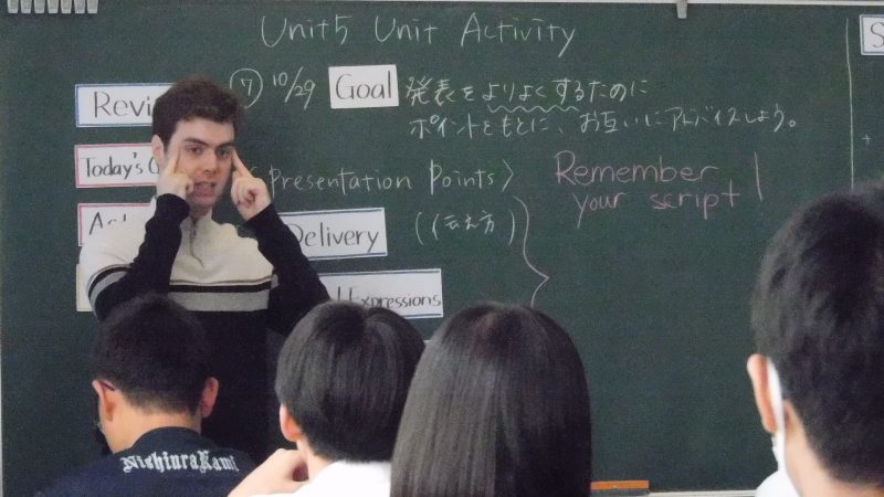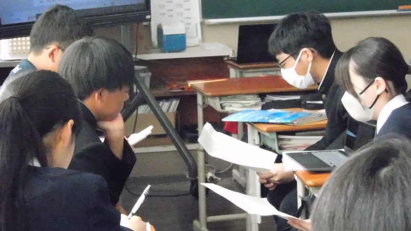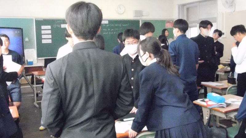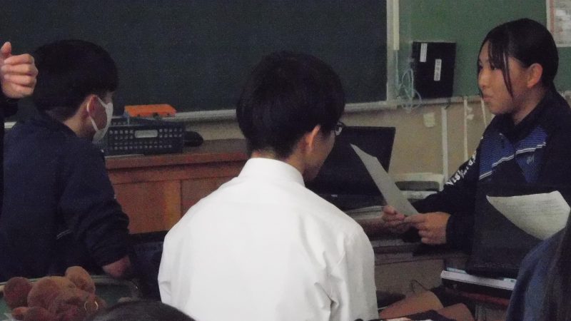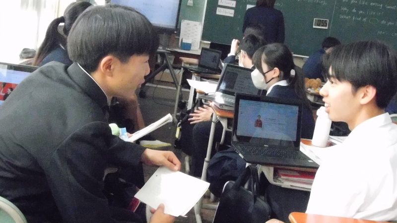 次に、個人で行う発表に向けて、ペアをつくって発表練習を行いました。その際、相互評価として、アドバイスを行いました。