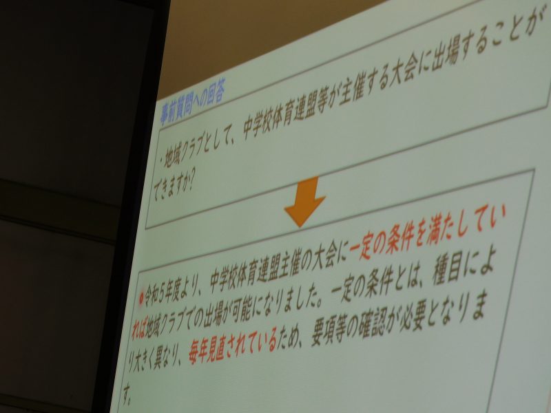 教育委員会の先生方より、休日の地域移行について、年度ごとの具体的な進め方、地域クラブ活動の運営として、指導者、活動場所、活動中のけが、事故等の対応などをスライドを用いて丁寧な説明がありました。