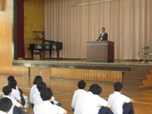 『将来の仕事や進路を考えるとき、お金のことを知るのはとても大切。例えば、「どんな仕事を選ぶとどれくらいお金がもらえるか」、「自分で生活できるためのお金の計画の立て方」などを知ることが自立への第一歩。今の勉強は、将来役立つスキルや知識を身につけるために大切。自分の未来(将来)を見通し、自分の夢や目標に向かって少しずつ考え、準備していってほしい。』という内容の講話でした。