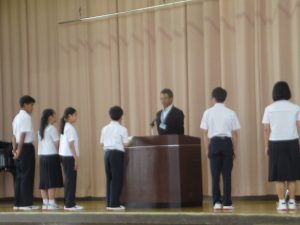 また、各学年代表3名が、「あいさつと返事」「行事を通して友達の良いところを見つけていく」「受験生として、みんなで励まし合って進路実現へむけて頑張る」など、2学期に向けての発表がありました。