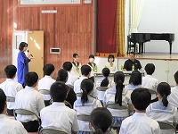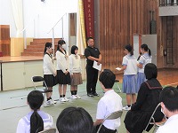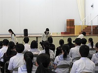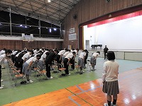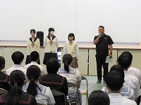 第3学年マナー講座 【更新日】2025年10月27日 10月27日(月)に本校体育館にて、3年生を対象として「マナー講座」を実施しました。 長崎女子商業高等学校の先生を講師としてお招きし、あいさつや高校受験の面接の仕方について講習していただきました。 3人の高校生の所作を模範にし、実際にあいさつをするなど学びを深めました。 今回の講座を通して学んだことを、高校受験時の面接や将来の社会生活で生かしてほしいと思います。