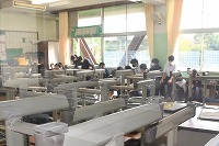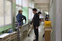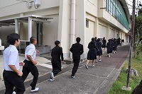 今回は生徒玄関から1年生の教室付近に不審者が入ってきたという想定で訓練を実施しました。不審者侵入後は教師が対応する中、生徒は教師の指示のもと、教室を施錠して不審者侵入に備えました。