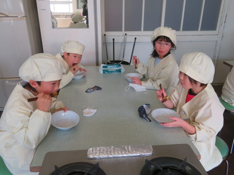 2年生【学校生活】 1/17(金) 収穫したいもをおいしく調理(1・2年生) 【更新日】2025年01月22日 2学期末に収穫したおいもを1,2年生みんなで調理して、おいしくいただきました。切ったり焼いたりするのは、担任の先生のお仕事でしたが、2年生は1年生を優しくリードしながら、皿をあらったり、台を拭いたり、後かたずけをしたりしていました。子どもたちは、自分たちが植えて、収穫したお芋をとても美味しそう食べていました。たくさん収穫できたので、ほかの学年にもおすそ分けし、食べてもらいました。収穫する喜び、それを自分たちで調理し食べる楽しさ、そして、みんなが喜んでくれる嬉しさなど、いろいろな気持ちを感じることができた活動でした。