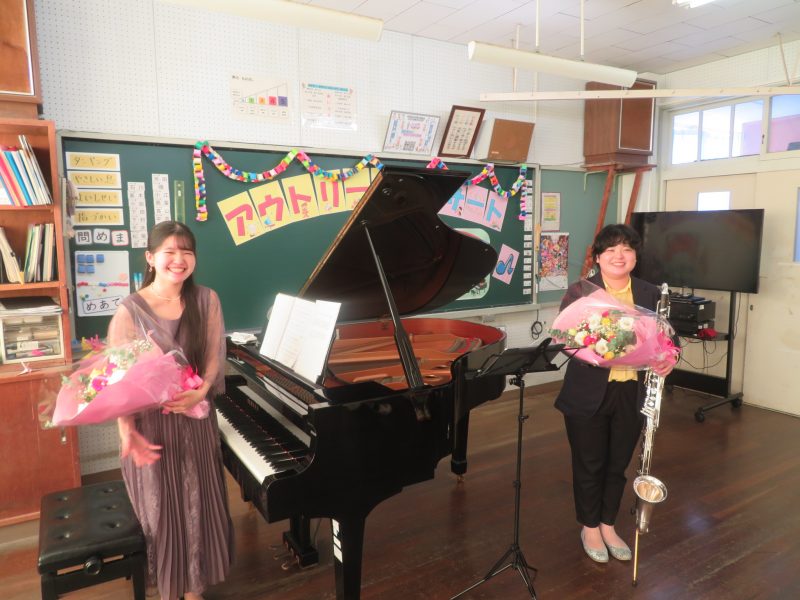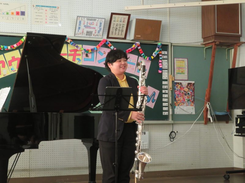 全校【学校生活】 11/18(月) アウトリーチコンサート 【更新日】2024年12月20日 今年は生の音楽演奏を子どもたちに聴かせたいと思い、学校で実施するアウトリーチコンサートに応募したところ、見事当選し、コンサート実施することができました。当日は、ピアノとバスクラリネットの奏者の方が来てくださいました。クラリネットは見たり聞いたりしたことがあった子どもたちも、バスクラリネットは初めてで、その大きさや音色に興味津々でした。しかも、とても至近距離での演奏の迫力に驚いていました。途中、ピアノの音が出るしくみについて詳しく教えていただいたり、ピアノを連弾したり、普通のコンサートとは違う工夫もあり、楽しくて、あっという間の1時間でした。