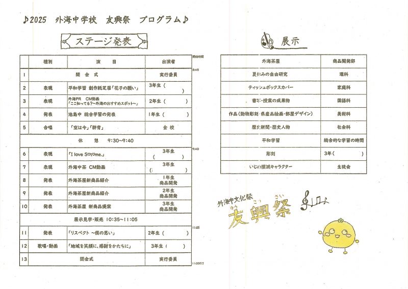11月8日(土)は友興祭(文化祭)を実施予定です。 プログラムが完成いたしましたので掲載させていただきます。ぜひお越しください。