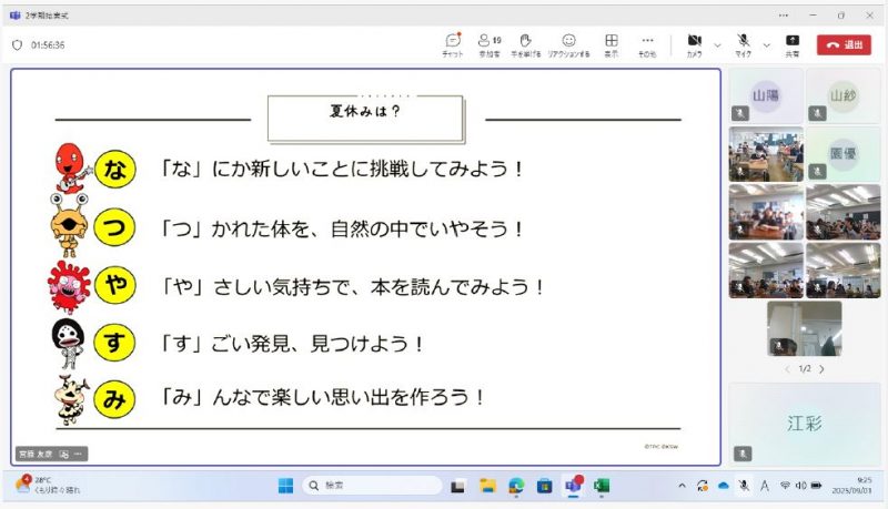 学校の様子【学校生活】 令和7年度 2学期が始まりました! 【更新日】2025年09月16日 9月1日(月)2学期がスタートしました! 久しぶりに会う子どもたちの笑顔と元気をたくさん見ることができました。 オンラインにて始業式が行われ、友達や先生方の話を聴くことができました。 充実した夏休みになったこと、2学期に向けて頑張りたいことを2年生代表の児童が、元気よく発表していました。 生活リズムを取り戻し、規則正しい生活を心掛けて、実りのある学校生活を送りたいと思います。