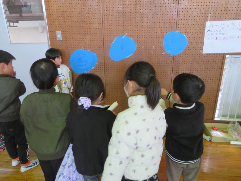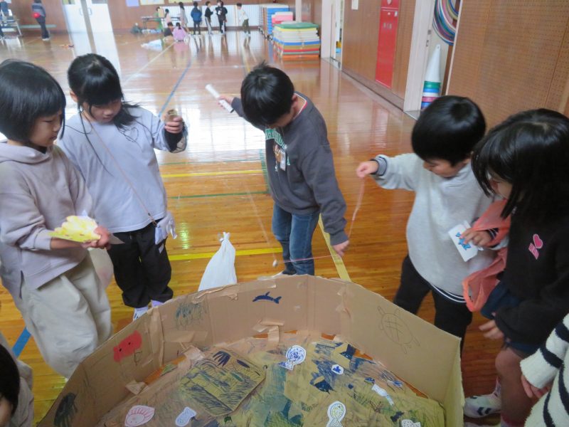 「おもちゃランド」とは、生活科の学習の一環で、手作りおもちゃを作って、1年生を招いて楽しんでもらう取組です。「ゴムロケット」や「魚釣り」、「紙とんぼ」など、たくさんの「お店」ができました。
