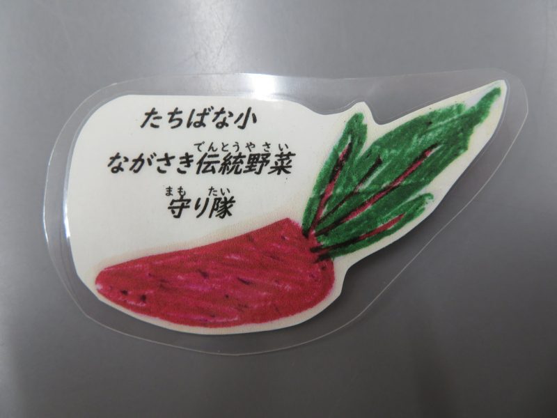 見学の後には、栄養教諭の安永先生特製の、伝統野菜守り隊バッジをもらい、3年生のみんなはこれからの活動もやる気いっぱいです。