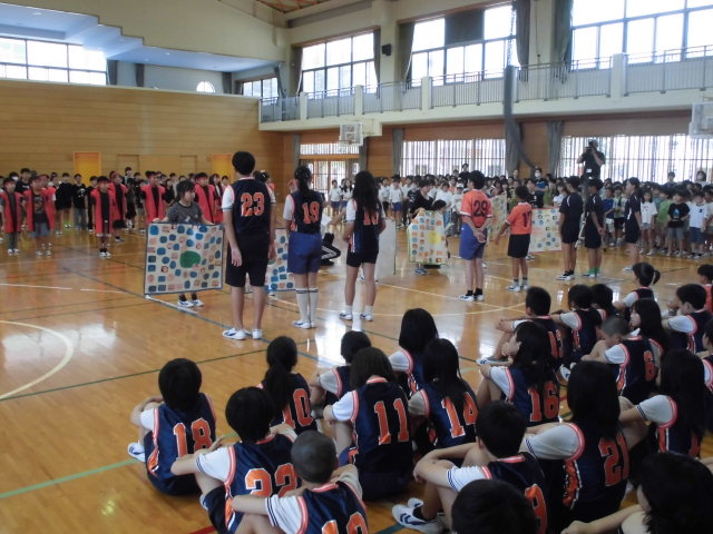 小体会出場選手を励ます会でした。キャプテンからチーム目標の発表がありました。元気いっぱいの全校応援に気合の入った6年生でした。 -