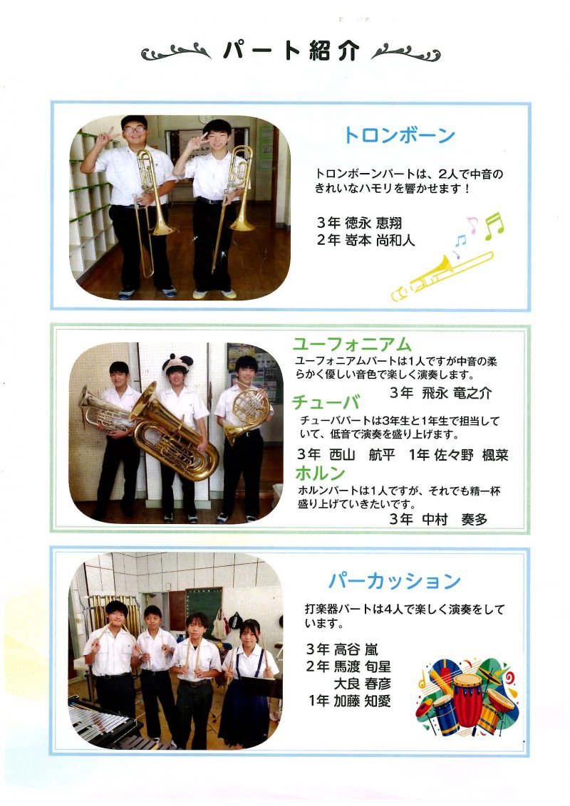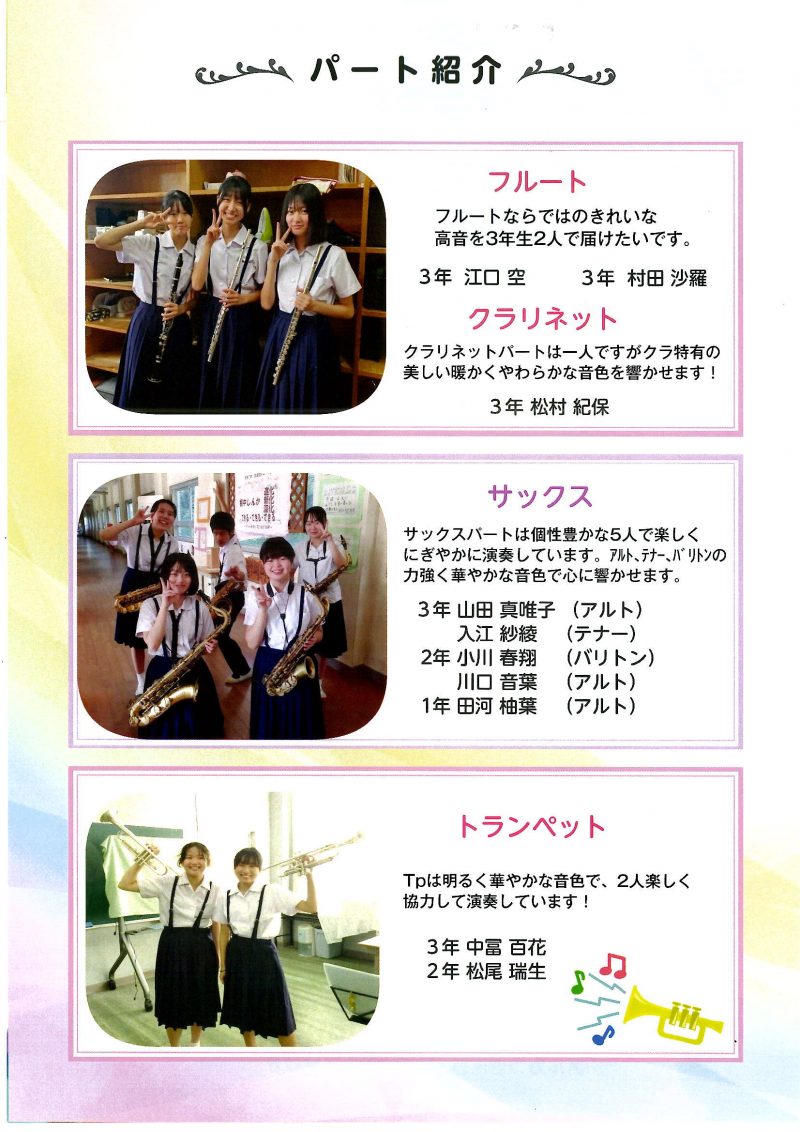 定期演奏会では、アンコール曲を含め計13曲演奏しました。一生懸命演奏する姿、手拍子を観客に求め演奏会を盛り上げようとする姿が見られ、聴く人の心を温める素晴らしい演奏会でした。この日で引退する3年生11名はソロを演奏しました。ステージの前で堂々と演奏する姿はとても立派でした。
