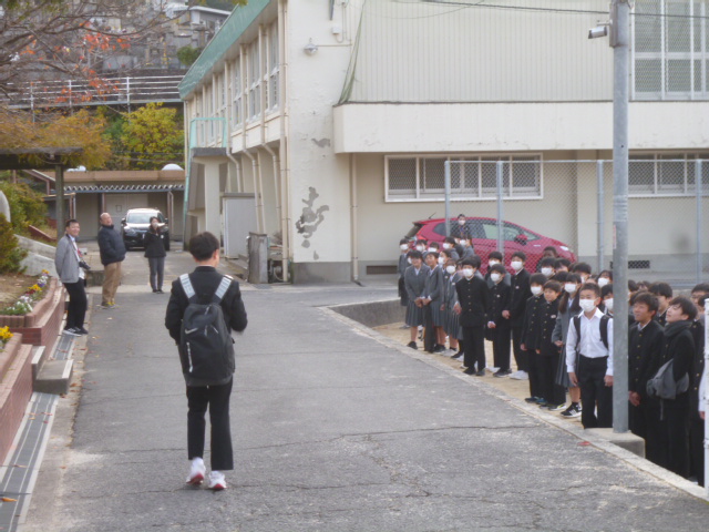 玄関前に、一列に並んで、先生方とともに、朝のさわやかなあいさつで、生徒の皆さんを迎えてくれました。