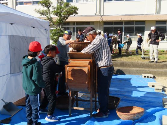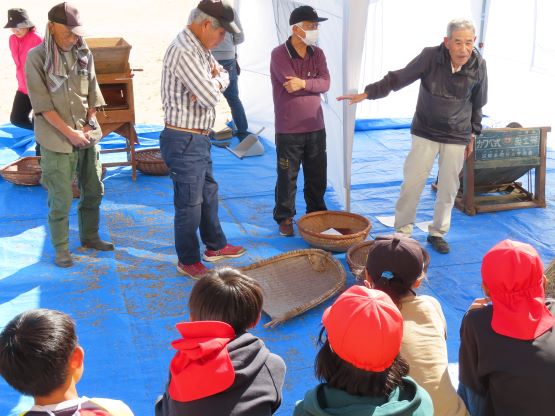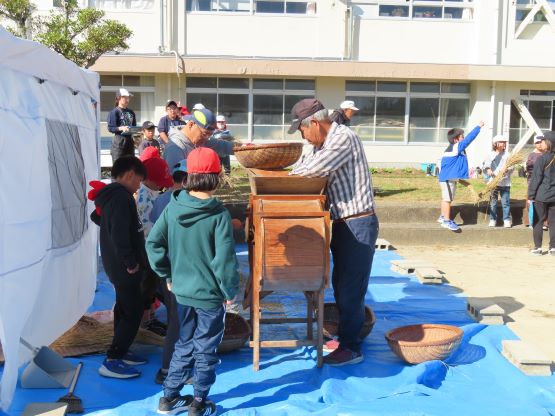 集める手箕(てみ)、唐箕も、もちろん昔の道具を使用します。(これらの昔の道具は、普段、本校の「社会科