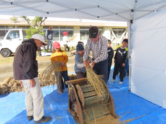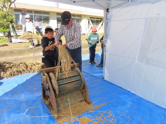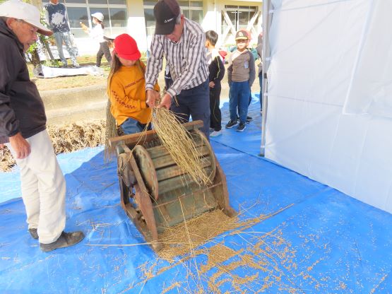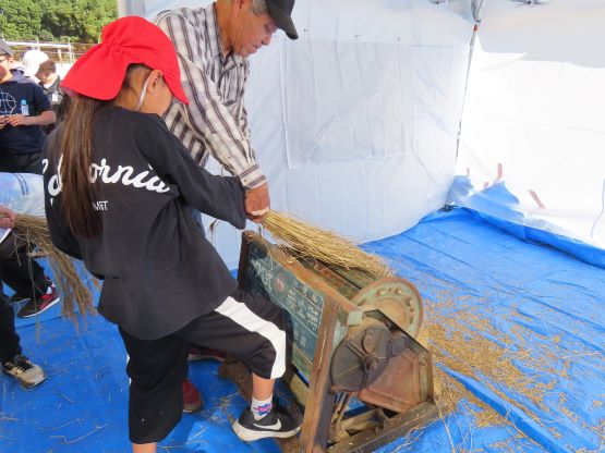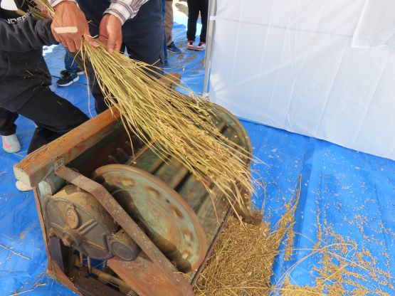 ところがありましたが、一人ずつ交代しながらスムーズに脱穀が行われていきました。脱穀機を通した後は、