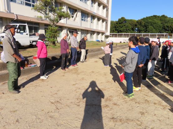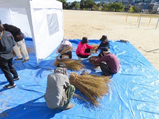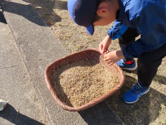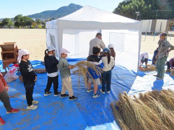 10/7に収穫し、はさがけした稲穂を横尾だんじり保存会の方が学校まで持って来てくださり、保存会の方の