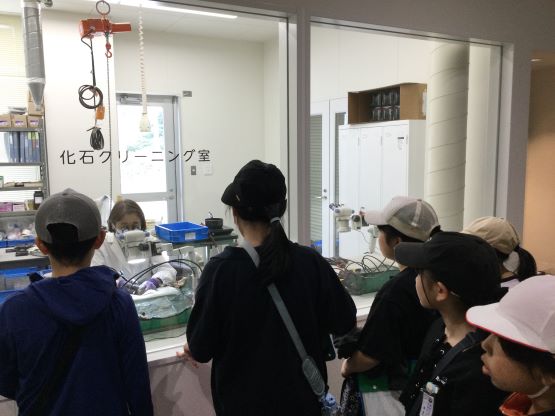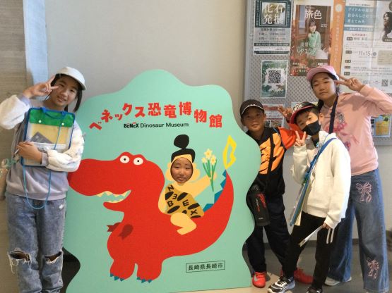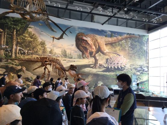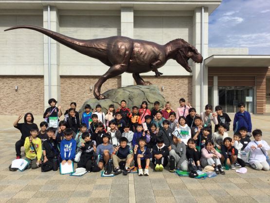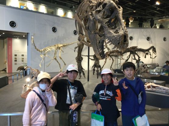 出発式を終え、貸し切りバスとジャンボタクシーに分乗して、まずは、ベネックス恐竜博物館へ向かいました。