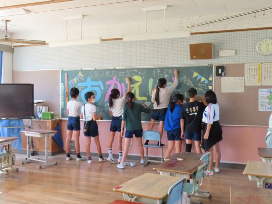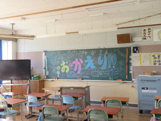 5年生の教室には、6年生からの「お帰りなさい」のメッセージが黒板いっぱいに飾られていました。