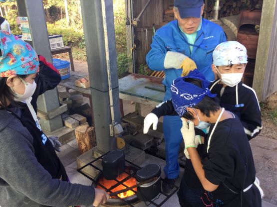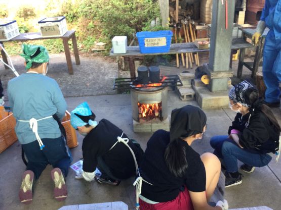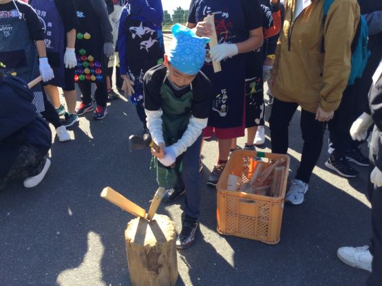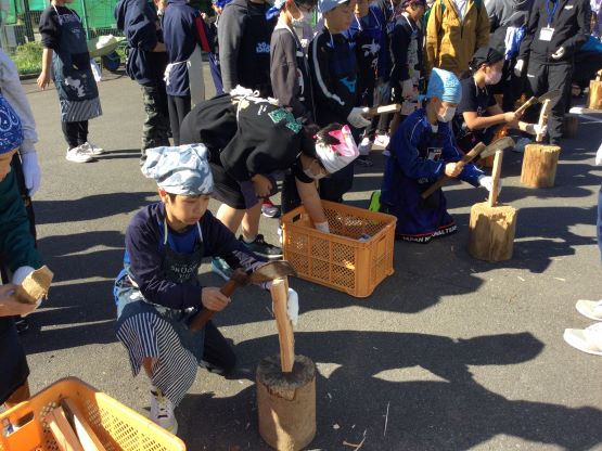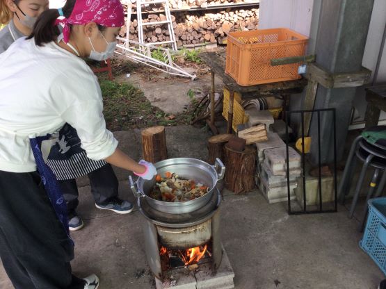 そして、最後の活動、炊爨場でカレーライスづくりを行いました。使用する薪は、自分たちで割った薪です。