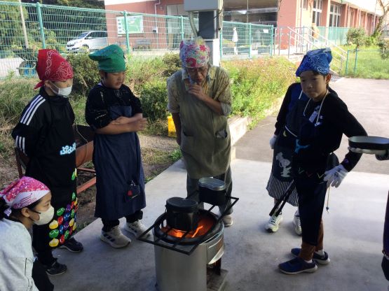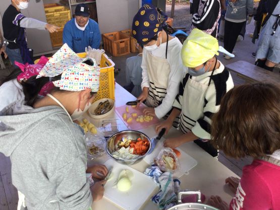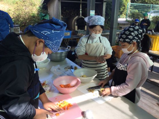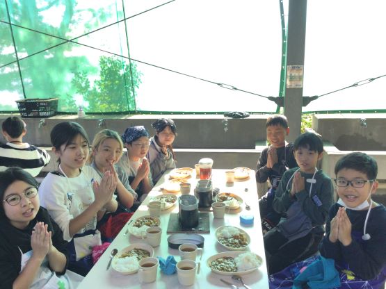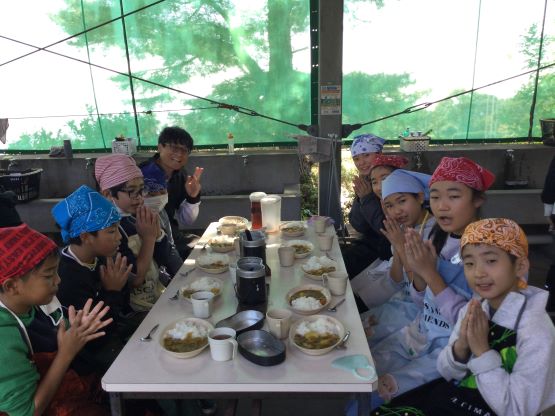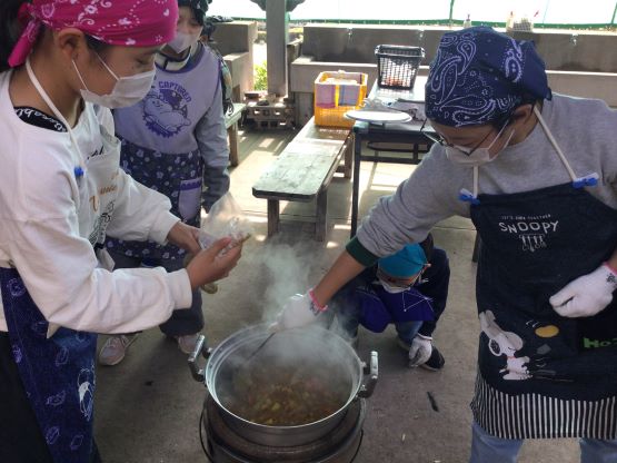 かまど係、ご飯係、野菜係等、各班で役割を分担し、スムーズにカレーライスをつくることができました。